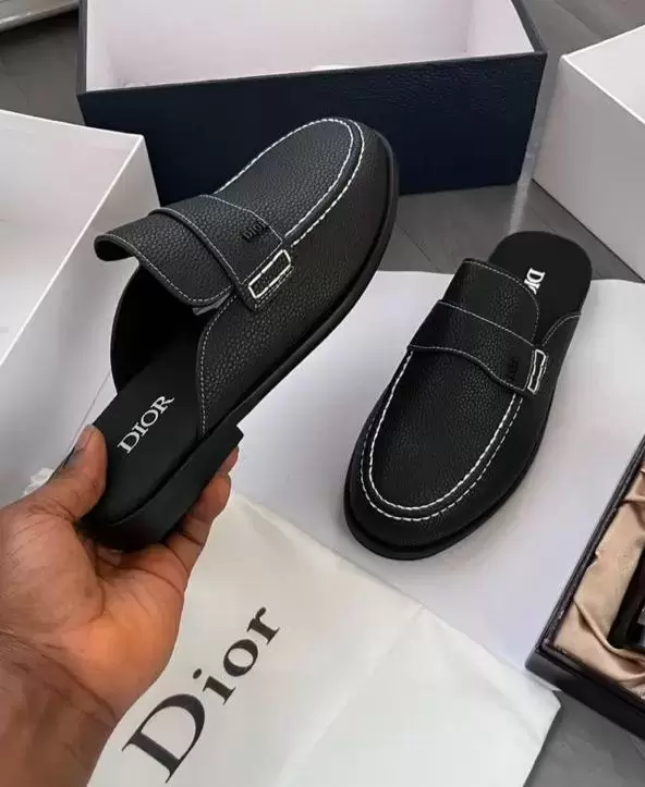 These are luxury, backless slip-on shoes from the French fashion house Dior. They combine the silhouette of a classic loafer with the comfort of a mule.