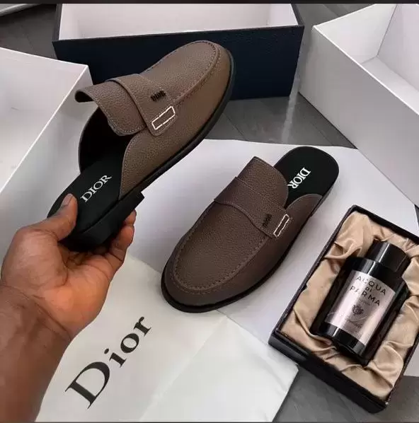 • Branding: The insole is black and clearly features the "DIOR" logo in white. The shoes are displayed with Dior branded packaging and a bottle of Acqua di Parma fragrance.