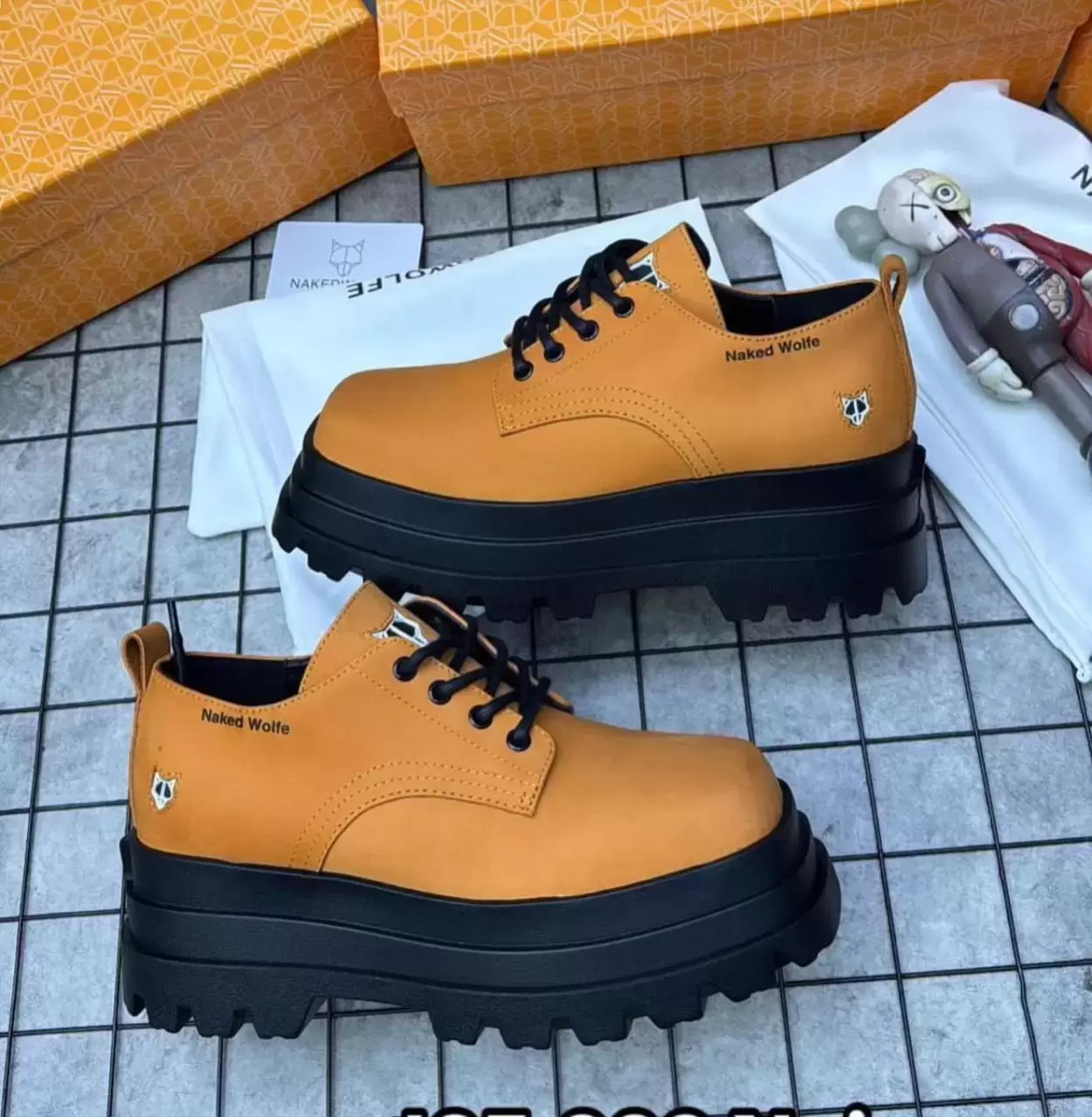 • Key Description: Tan (or Light Brown) Lace-Up Platform Shoes with a contrasting Black Chunky/Lug Sole. They feature the small Naked Wolfe "Wolfe head" logo on the side of the heel.